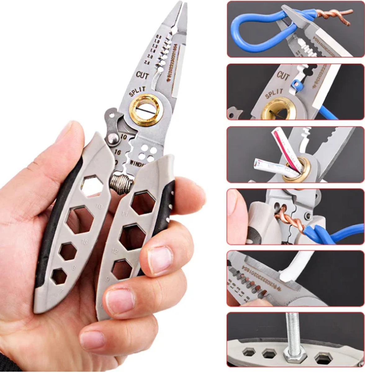 ¡Optimiza tus trabajos de cableado con nuestro Alicate Multifuncional! Diseñado para ser una herramienta versátil y precisa con 16 funciones en 1, se adapta a todas tus necesidades eléctricas. Desde cortar hasta enrollar, este alicate es el compañero perfecto para cualquier trabajo eléctrico.